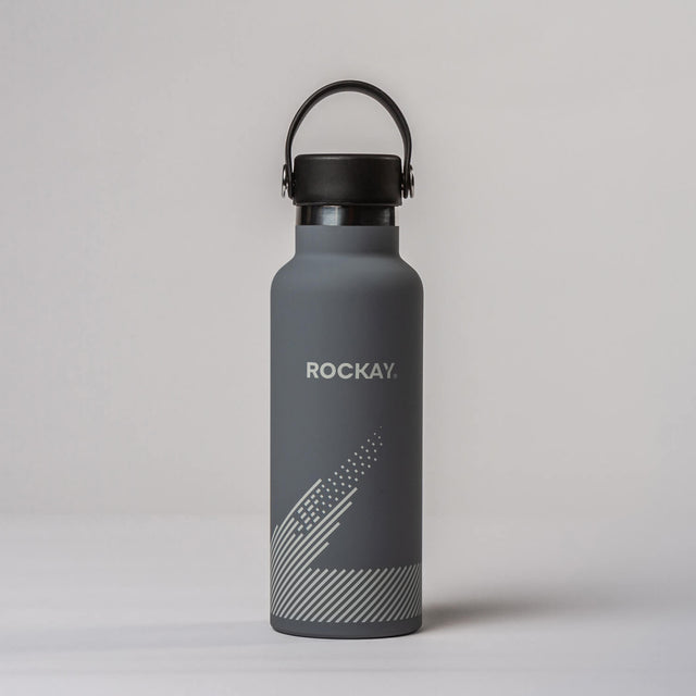 The human body is made up of around 60% water, so it's probably best to keep it that way whatever the day throws at you. Our new durable Rockay 500ml Water Bottle is made with recycled materials and is equipped with an attachment handle making it perfect for a track workout, weekend hike or for those city commutes. Temperature controlled and insulated featuring double-walled recycled stainless steel construction, keeping your water cold or hotter beverages hot for hours on-end. Screw-top lid made from recycled materials and is approved BPA-free.
